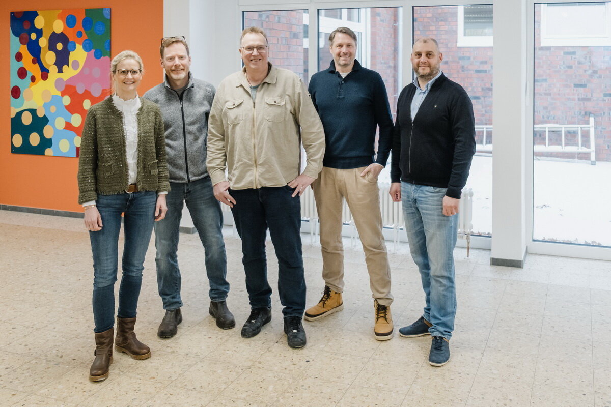 Freuen sich über die Investition in Bildung: Bürgermeisterin Dr. Henrike Voet, Konrektor Philipp Lampe, Schulleiter Carsten Ripke, Architekt Sebastian Latal und Sergej Garrecht vom Bauamt der Stadt Lohne (von links).