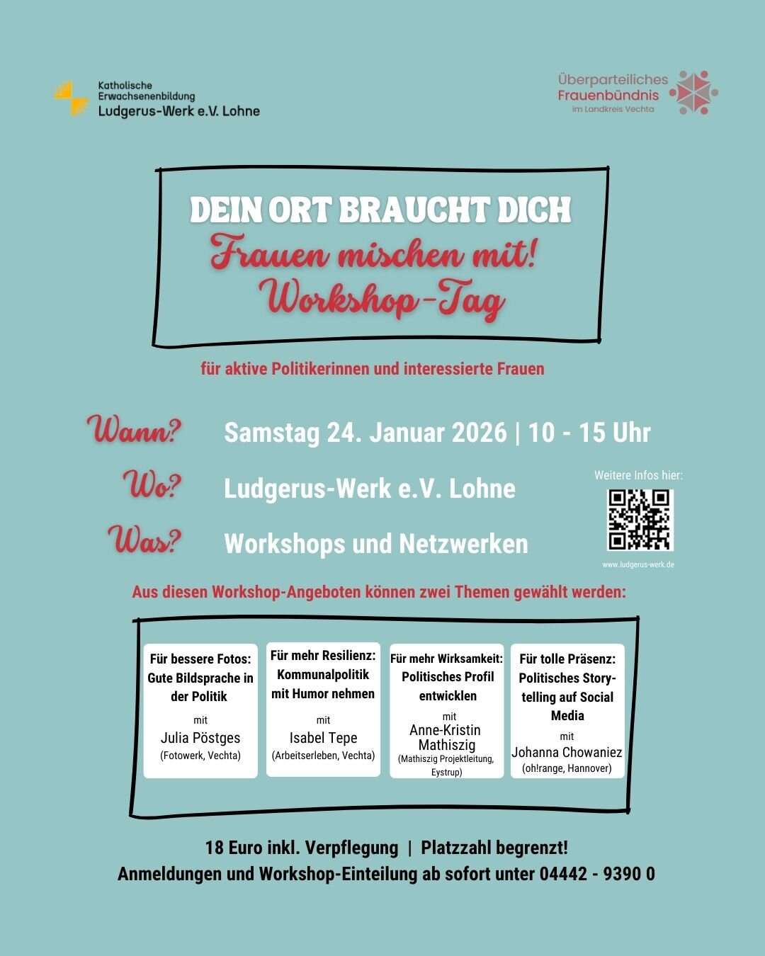 Mehr Sichtbarkeit, mehr Wirkung, mehr Sicherheit im Auftreten: Das Überparteiliche Frauenbündnis im Landkreis Vechta lädt am Samstag (24. Januar 2026) zum Workshop-Tag ins Ludgerus-Werk e. V. Lohne ein. Das Angebot richtet sich an aktive Politikerinnen und interessierte Frauen, die sich für kommunalpolitisches Engagement stärken und weiterentwickeln möchten – ganz praktisch und direkt anwendbar.