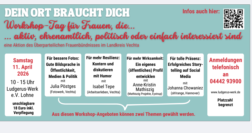 Unter dem Motto „Dein Ort braucht dich“ lädt das Überparteiliche Frauenbündnis im Landkreis Vechta am Samstag (11. April) von 10 bis 15 Uhr ins Ludgerus-Werk e.V. Lohne ein. Der Workshop-Tag bietet praxisnahe Impulse für mehr Präsenz, Wirksamkeit und Sicherheit im öffentlichen Auftreten. Referentinnen aus den Bereichen Kommunikation, Fotografie, Persönlichkeitsentwicklung und Social Media vermitteln konkrete Strategien und erprobte Werkzeuge. Die Teilnahmegebühr beträgt 18 Euro inklusive Verpflegung, die Platzzahl ist begrenzt.