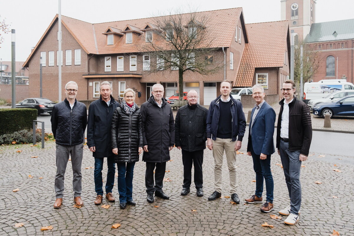 Adolf-Kolping-Haus VerkaufBeteiligte am Projekt: Architekt Thomas Haves, der Leiter der städtischen Liegenschaftsabteilung Maik Bakenhus, Bürgermeisterin Dr. Henrike Voet, Mitglied des Kirchenausschusses Heiner Taphorn, Domkapitular Rudolf Büscher, Immobilienunternehmer Michael Fabrewitz, Kirchenverwaltungsleiter Rainer Meyer und Architekt Sebastiaan Hogt (von links).