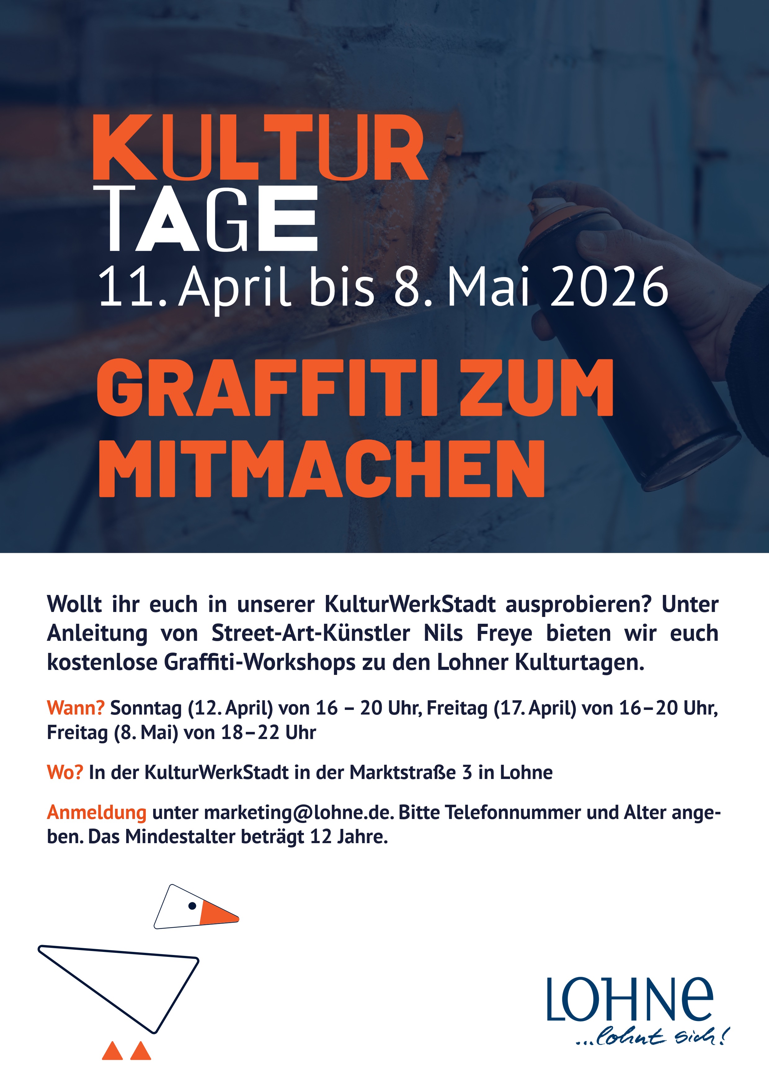 20260323_KT_Flyer_1seitig_Graffiti-Workshop Zu den Kulturtagen wird ein Leerstand in der Lohner Innenstadt zur KulturWerkStadt. An drei Terminen bietet die Stadt Interessenten kostenlose Graffiti-Workshops an: