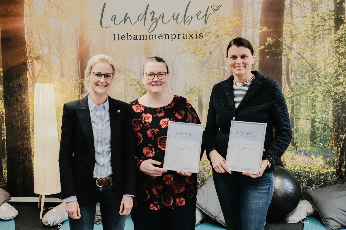 Hebammenpraxis FörderungBürgermeisterin Dr. Henrike Voet überreicht die Förderurkunden an Christina Lamping und Nadine Schröder-Olberding (von links) von der Hebammenpraxis Landzauber.