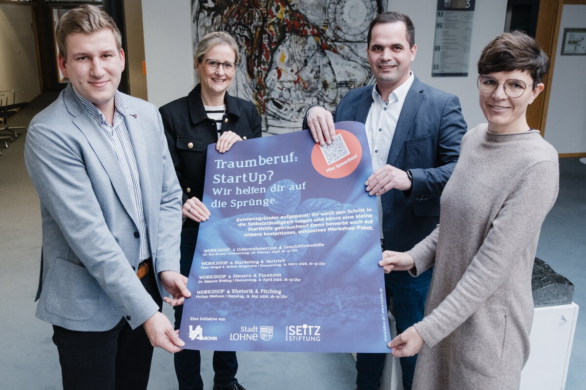 Gründer-WorkshopsWirtschaftsförderer der Stadt Vechta Matthias Hartz, die Lohner Bürgermeisterin Dr. Henrike Voet, der Vechtaer Bürgermeisterin Kristian Kater und die Wirtschaftsförderin der Stadt Lohne Anne Nußwaldt (von links) stellen das Projekt vor.