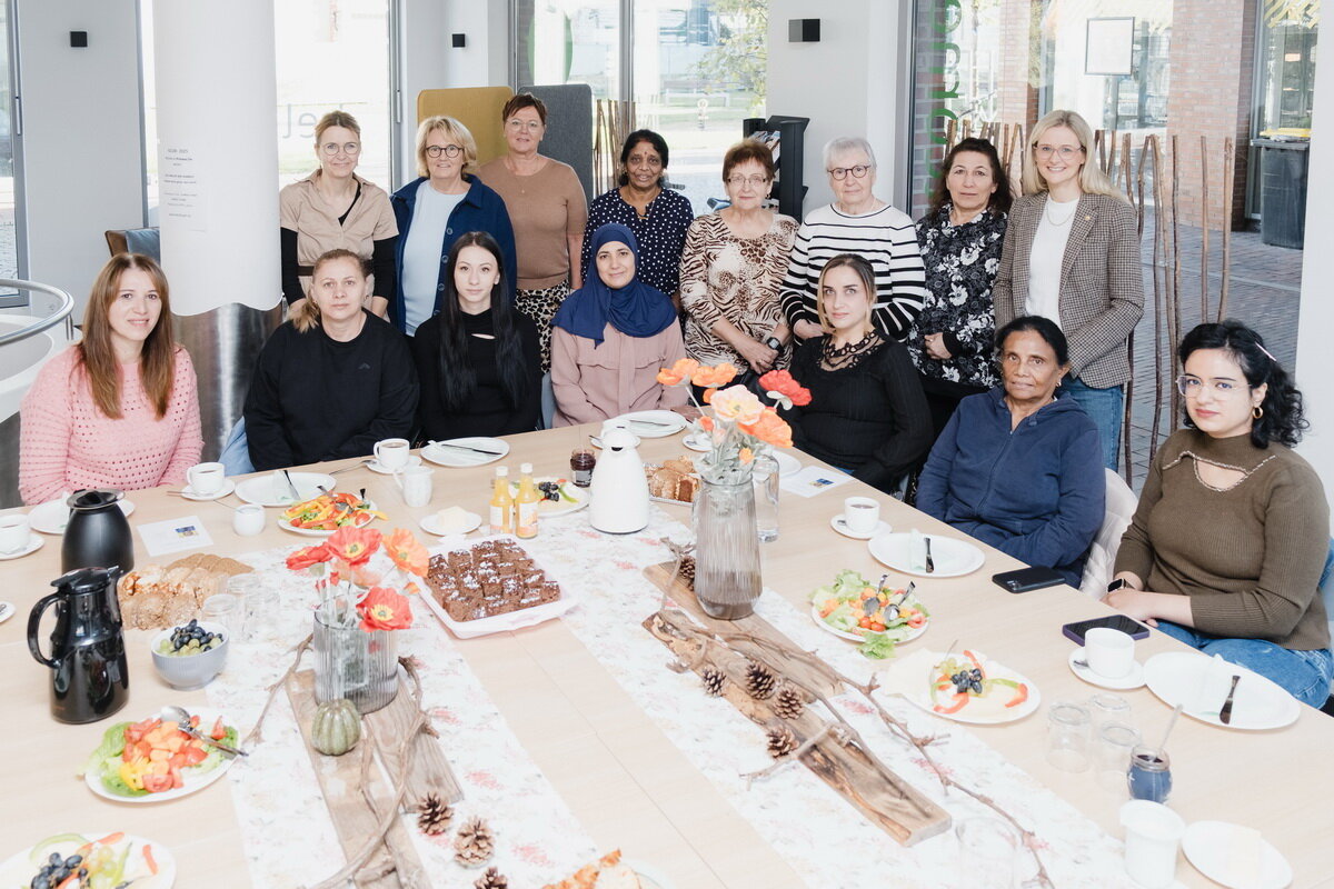 Die Teilnehmerinnen des „Bunten Frauenfrühstücks“ im Rahmen der Interkulturellen Woche mit Landtagsvizepräsidentin Dr.in Tanja Meyer, Ratsfraue Manuela Deux und Organisatorin Christiane Kröger (hintere Reihe, von links) und Bürgermeisterin Dr. Henrike Voet (hintere Reihe, 1. von rechts).
