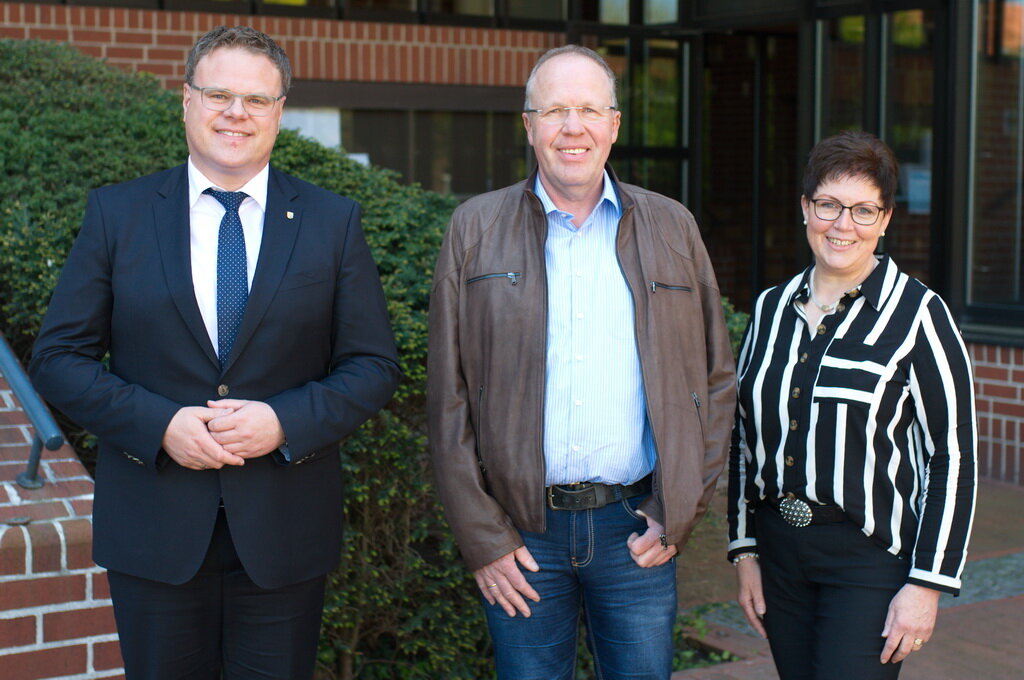 Bürgermeister Tobias Gerdesmeyer (links) gratuliert Reinhard Krebeck mit seiner Frau Monika zum 25-jährigen Dienstjubiläum.