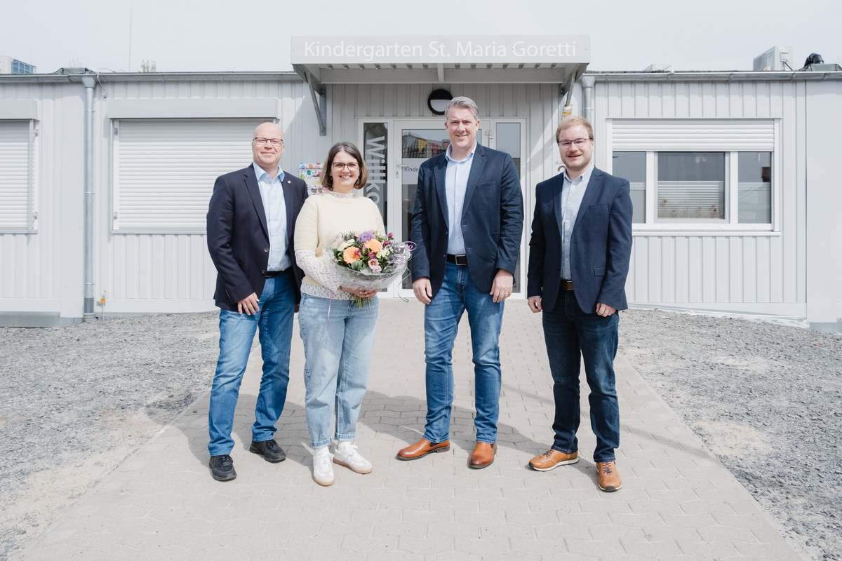 Erster Stadtrat Gert Kühling, Kita-Leiterin Jasmin Winter, Sebastian Wolke (Leiter des Amtes für Familie und Soziales) sowie Hendrik Echtermann, Ökonom des Pastoralen Raums Damme (von links) machten sich ein Bild von der mobilen Kita.