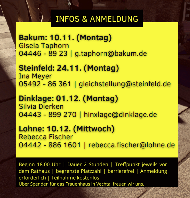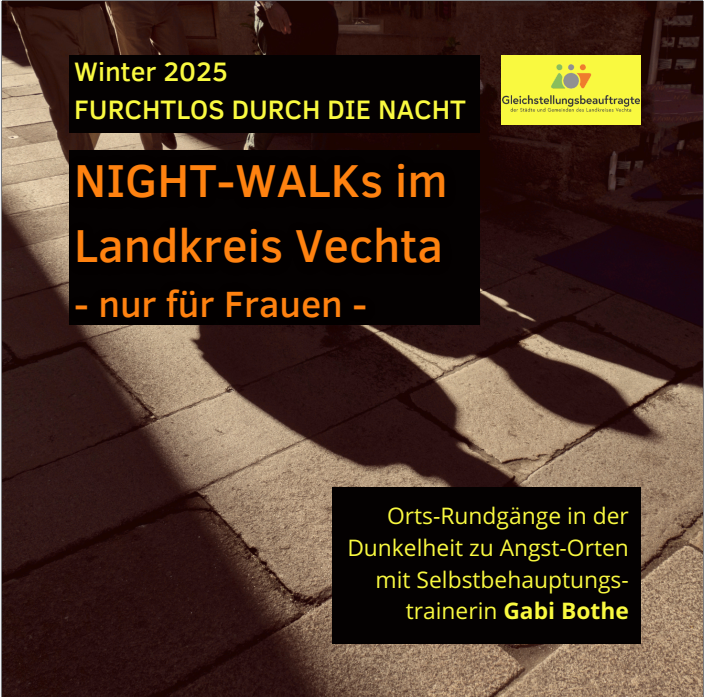 Im Winter 2025 lädt der Landkreis Vechta Frauen zu besonderen Abendspaziergängen ein. Unter dem Motto „fruchtlos durch die Nacht“ geht es nicht um sportliche Leistung, sondern um ein gemeinsames Erlebnis: zusammen unterwegs sein, Orte in der Dunkelheit bewusst aufsuchen und dabei ein Gefühl von Stärke und Sicherheit entwickeln.