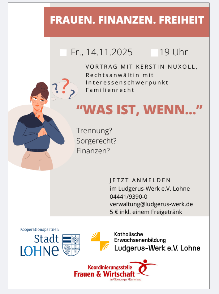 Unter dem Titel „Frauen. Finanzen. Freiheit.“ lädt das Ludgeruswerk Lohne am Freitag (14. November) um 19 Uhr zu einem informativen Abend ein. Zu Gast ist die Rechtsanwältin Kersti Nuxoll, die praxisnah erläutert, worauf es in rechtlichen und finanziellen Fragen im Falle einer Trennung ankommt.